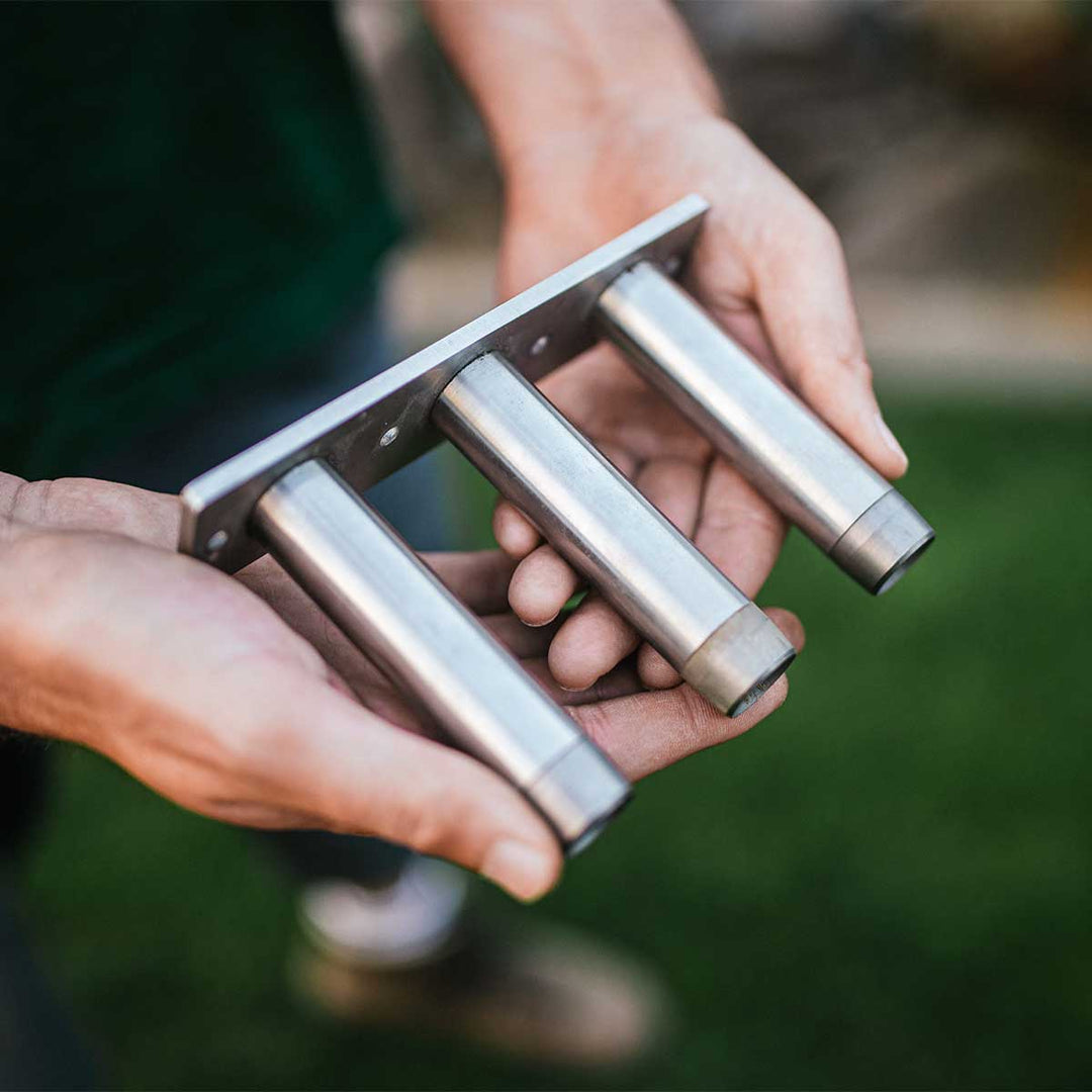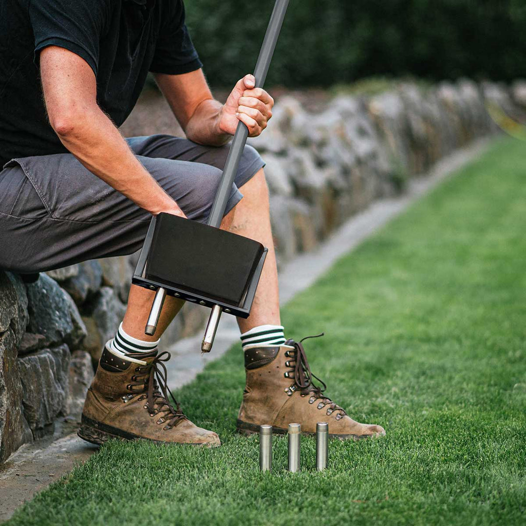 Der Stiel des Rasenspechts ist in zwei Varianten erhältlich: aus pulverbeschichtetem Stahl oder aus Edelstahl. Durch die zentrale Anordnung des Stiels ist der Aerifizierer besonders leicht und einfach zu handhaben. Du kannst ihn mühelos tragen und bedienen, was gerade bei längerer Nutzung ein großer Vorteil ist.