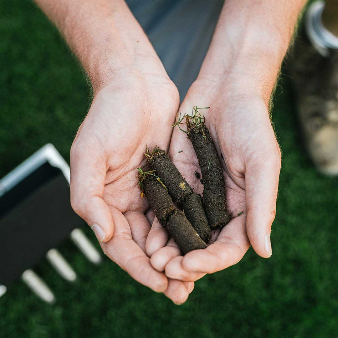 Darüber hinaus werden die Spoons durch das hochwertige Metallverarbeitungsverfahren Bördeln unlösbar mit der Halteplatte verbunden – für maximale Haltbarkeit. Ein weiteres Alleinstellungsmerkmal ist die konische Form der Spoons, die über ihre gesamte Länge schmaler wird. Dadurch fallen die ausgestochenen Erdteile problemlos in die Auffangwanne, ohne dass sie sich im Spoon festsetzen. Unsere Technologie ist auf dem Markt einzigartig und sorgt dafür, dass dein Aerifizier-Prozess effizienter abläuft da die Spoons nicht ständig verstopfen.